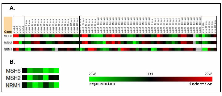 Great similarity of expression was also seen in the activities of MSH2, MSH6, and NRM1 in response to alpha-factor, though their expression was not significant at a Pearson Correlation of >0.8 [Roberts 2000]. Alpha-factor is secreted by yeast cells during mating and activates Protein Kinase C which in turn sets off a signaling cascade in the yeast cells that triggers a variety of changes in the transcription of the genome [Roberts 2000].