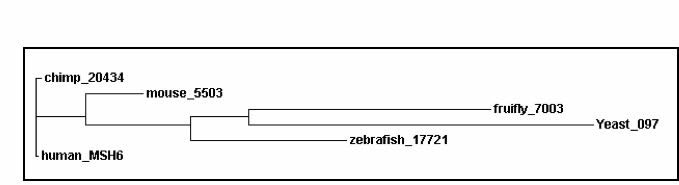 The MSH6 gene, located on chromosome 2 in humans, is quite heterogeneous and has been identified in numerous and diverse species, from yeast to fruitfly to zebrafish to mouse to chimpanzee [BLAST; Ensembl]. Not only is the gene found in multiple species, it is also quite well conserved among them [Figure 1] [Ensembl; EBI Tools: ClustalW]. Human and yeast MSH6 show the lowest level of conservation at the amino acid level (28%) while human and chimpanzee show the highest conservation (99%) [EBI Tools: Clustal W].
