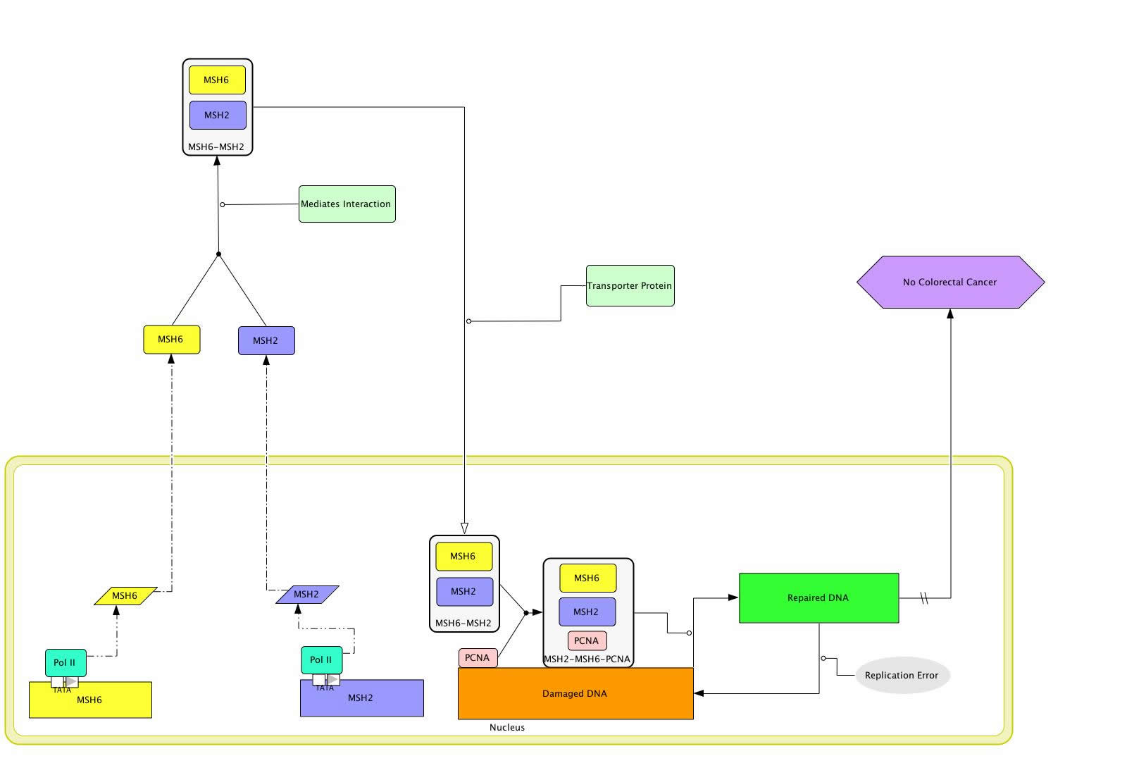 Mutations in the MSH6 gene have been implicated in the predisposition of an individual to develop colorectal cancer, though it is unclear why the colon seems to be preferentially affected by alterations in MSH6 activity [Colon Cancer]. MSH6 is located on chromosome 2 and associates with the protein of the MSH2 gene to form a heterodimer that plays a role in DNA repair during mitosis [Ensembl Genome Browser; Kariola 2002; OMIM]. Several possible mechanism for aberrant DNA repair in the presence of an MSH6 mutation have been suggested, including decreased stability of the MSH2-MSH6 heterodimer and an inability to bind to mismatched DNA [Kariola 2002; Bowers 1999].