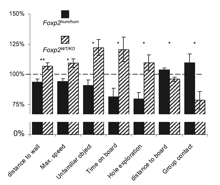 Mice with two alleles for "humanized" FOXP2 (FOXP2 hum/hum) were compared with mice with one wild-type FOXP2 allele (FOXP2 wt/ko) in order to simulate the functional differences between normal human FOXP2 and people with language disorders due to a nonfunctional FOXP2 allele. Mice were subjected to numerous behavioural tests, and results were normalized to homozygous wild-type (FOXP2wt/wt) mice. The figure below shows behaviours that were significantly different between strains. Overall, humanized FOXP2 mice showed less exploratory behaviour than wild-type and FOXP2wt/ko mice. However, humanized FOXP2 mice participated in significantly more group contact than either other strain. Humanized FOXP2 had no notable effects on other tested behaviour or any other organ.