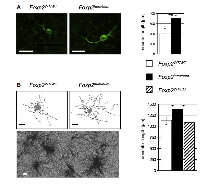 Narrowing the investigation to the medium spiny neurons, neural cells from FOXP2hum/hum and FOXP2wt/wt mice were grown in vitro. They found that neurons with humanized FOXP2 grew longer neurites (Figure 4A below). In vivo, they found that dendrites were on average 22% longer than wild-type mice (Figure 4B). FOXP2wt/ko mice that are meant to model verbal dyspraxia had shorter dendrites than wild-type, but this difference was not statistically significant.