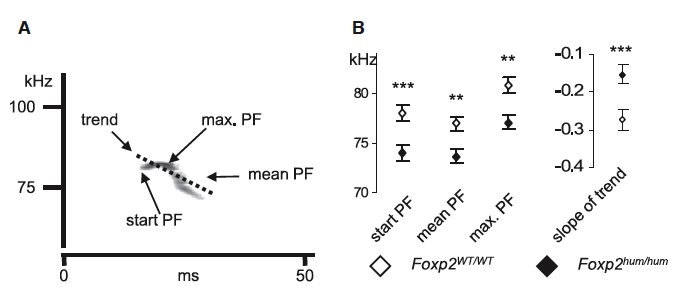 | As a final test, the influence on vocalization in humanized FOXP2 mice was measured (Figure 6, right). Frequency measurements (kHz) were taken for FOXP2hum/hum mouse pups and FOXP2wt/wt pups at the points labeled in Figure 6A. Overall, the humanized FOXP2 mouse pups made lower-frequency sounds than wild-type pups when put in isolation. Although this finding is very interesting and reproducible, Enard et al. remark "it is important to note that this influence is subtle and within the range of normal variation among mice." |