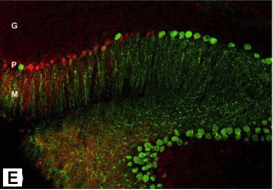 FoxP2, however, is not expressed in dopaminergic neurons. It is expressed in medium spiny neurons - the major targets of dopaminergic neurons - that make up 90% of neurons in the striatum. As previously noted, the striatum is known to be the affected area in patients with developmental verbal dyspraxia and in FOXP2 knockdown songbirds. This staining of the cerebellum (right) shows FoxP2 (red) and calbindin (green) in Purkinje cells and medium spiny neurons, which have roles in controlling body movements. |