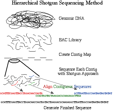 The advantage to the hierarchical approach is sequencers are less likely to make mistakes when assembling the shotgun fragments into contigs as long as full chromosomes. The reason is that the chromosomal location for each BAC is known, and there are fewer random pieces to assemble. The disadvantage to this method is time and expense. The shotgun method is faster and less expensive, but it is more prone to errors due to incorrect assembly of finished sequence. For example, if a 500 kb portion of a chromosome is duplicated and each duplication is cut into 2kb fragments, then it would be difficult to determine where a particular 2 kb piece should be located in the finished sequence since it occurs twice. You might think, "who cares since they're duplicates?" But duplications seldom retain their original sequences; they tend to drift over time. So a small region may be retained while other parts may mutate. This might create overlapping sequences for small pieces that are located several hundred kb apart on the chromosome.
