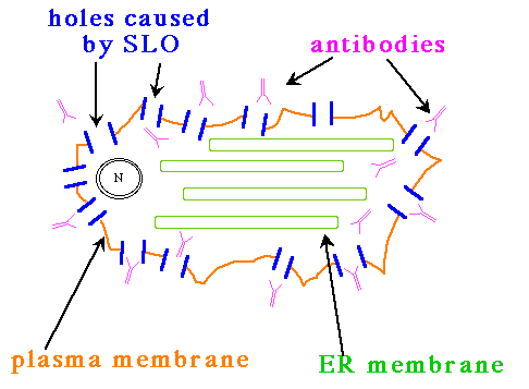 Figure 2. After the cells are warmed to 37° C and calcium is removed, the bound SLO monomers become embedded in the plasma membrane to create holes. Since there are no SLO monomers still in solution, none of the other membranes will be permeabilized by SLO; note that the ER and nuclear membranes are left unaffected.