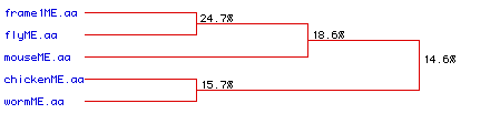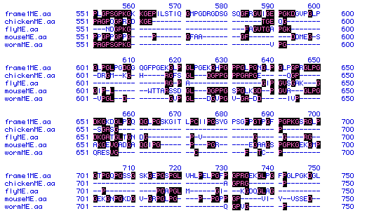 This portion of the analysis consisted of comparing the collagen protein sequences (primary structure or order of amino acid residues) from each of the five organisms listed above (Gallus gallus, Caenorhabditis elegans, Drosophila melanogaster, Mus musculus, and Homo sapiens). A short sequence of the comparison appears below. It is clear that the collagen samples contain a limited amount of homology as the amino acid sequences had to be manipulated (spaces were added or removed) quite extensively in order to obtain the best alignment. Normally, this would suggest poor homology between the protein samples (i.e., the proteins most likely do not have a common protein origin or "ancestor"). In this case, however, the protein from Gallus gallus (chicken) was only a small piece or fragment of the entire protein. Because the entire protein was not available for analysis, the entire alignment procedure was altered. The poor alignment, therefore, might be explained in this manner. Furthemore, the collagen protein sequences from worm and fly were also quite short making an accurate (or exact) alignment very difficult.