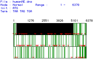 The DNA analyzed was the human cDNA for collagen. The largest reading frame of this DNA was chosen. This segment of the DNA began at nucleotide number 235 and terminated at nucleotide 5271. The image below shows the entire segment of cDNA. The largest reading frame, designated by the black box was the segment of DNA used for the rest of the DNA analysis.