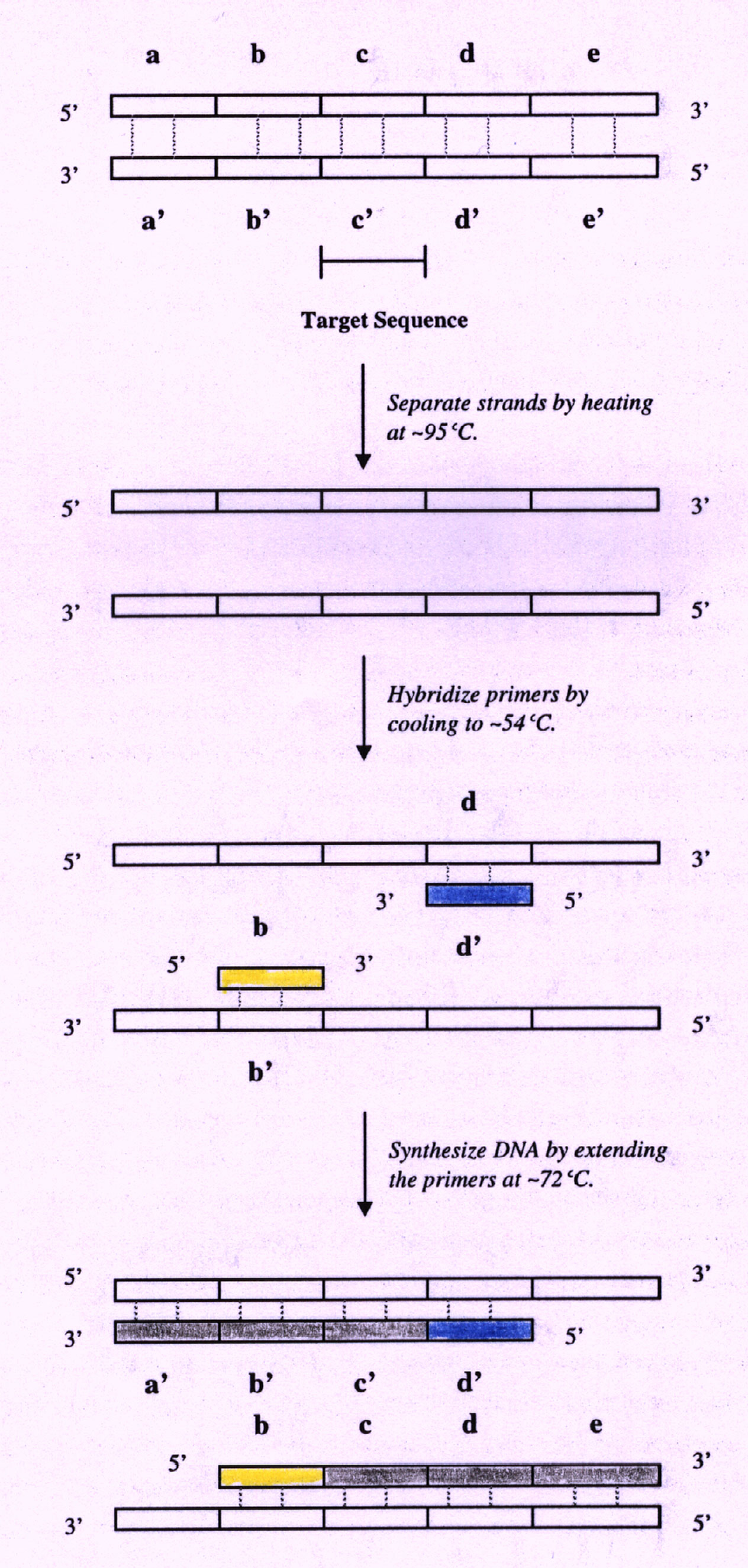"Mr. Cycle" abruptly cools the PCR mixture to around 54 degrees Celsius. The temperature of this step is highly variable, depending on the size of the primer and its homology to the target DNA (McClean 1997). The primers are permitted to hybridize between 15 seconds and 2 minutes (Podzorski et al. 1997). In Figure 1, the two primers, d' and b attach to the flanker regions surrounding the target sequence. The primers are added in excess to prevent the formation of DNA duplexes (Stryer 1995).