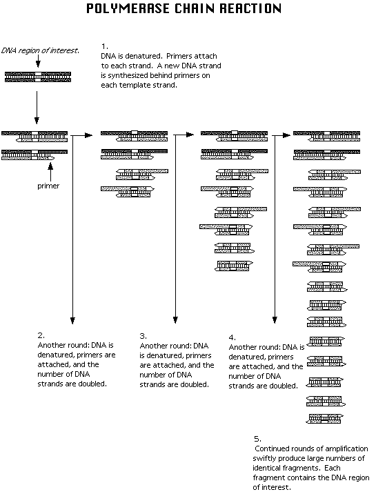 Not only is this technique fast and efficient, it is also applicable to the work of scientists in a variety of disciplines. PCR helps researchers in fields ranging from human health (especially with respect to HIV detection), to forensic studies, to evolutionary relationships, to ecological studies and animal behavior (Powledge 1998). PCR's multitude of applications comes from its ability to amplify small fragments of DNA which are "lost" amongst the large background of the total nucleic acid ("From Simple Ideas" 1998). In fact, there is enough DNA in one-tenth of one-millionth of a liter (0.1uL) of human saliva (which contains a small number of shed epithelial cells) to use the PCR technique to distinguish a particular genetic sequence as human. Furthermore, there is enough DNA trapped in an 80 million year-old fossilized pine resin to amplify by PCR (Brown 1995). In short, very little DNA is needed to make PCR work.