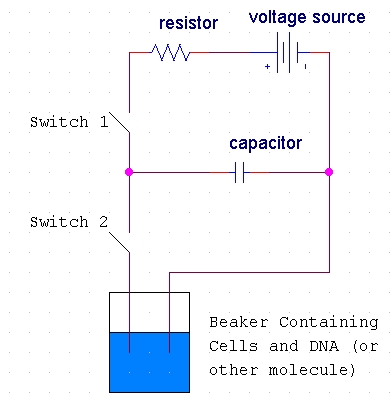 The host cells and the molecules to be inserted into these cells are suspended in solution. The electroporation apparatus is typically commercially produced and purchased, but the basic process inside such an apparatus may be represented in a schematic diagram (Fig 2).