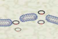 Figure 3. Graphic representation of plasmids containing a foreign DNA insert passing through temporary aqueous pores in the plasma membrane. The actual entry of DNA into the cell cannot be observed with a microscope, but this artist's rendering shows the basic concept of the formation of pores in the membrane through which DNA can pass (Maxcyte, 2002). Image from http://www.maxcyte.com/technology.html Permission pending.
