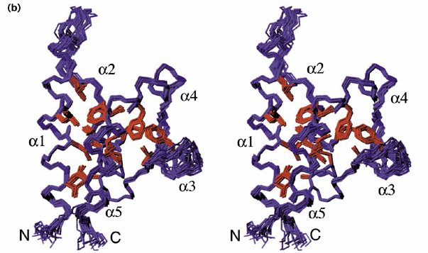 Figure 3. The structure of the HRDC domain. The structure of the HRDC domain shown in this diagram was determined by NMR spectroscopy from the WRN homolog Sgs1. The residues shown in red are the highly conserved hydrophobic sidechains that are essential to the folding of the protein. (Liu et. al. 1999). Image from http://journals.bmn.com/journals/list/browse?uid=JSTR.st7c05&rendertype=text Permission Pending.