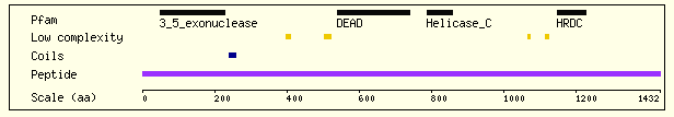Figure 2. The structural/functional domains of WRN. This diagram shows some of the major structural domains of the WRN protein that are important to its function. It also indicates the locations of coils and regions of low complexity and their relative positions in the amino acid sequence (N-terminal to C-terminal shown left to right). Image from http://www.ensembl.org/Homo_sapiens/protview?peptide=ENSP00000298139&db=core Permission Obtained.