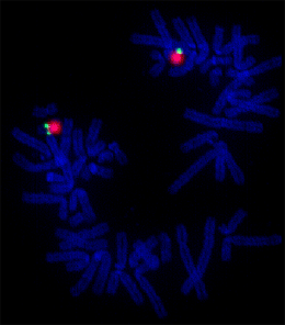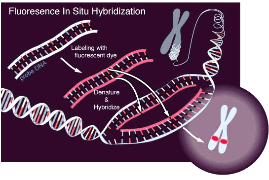 The above diagram illustrates the process of Fluorescence In-Situ Hybridization (FISH). The figure was obtained from the National Health Museum website. Permission to use this diagram is pending.
