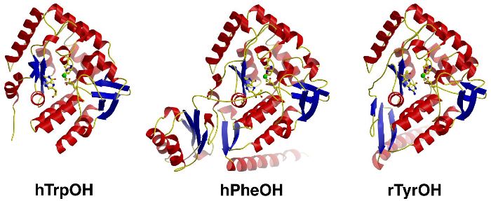 The 221 to 360 amino acid sequence described above is also highly conserved in TrpOH and TyrOH. Again, the strong conservation suggests that there is an important function found within this sequence's structure. According to the Stevens Laboratory at The Scripps Research Institute, TrpOh, TyrOH and PheOH are very similar in structure, as shown by their illustration below.