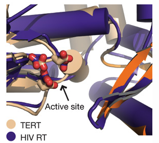 Figure 2 (right). Superposition of HIV RT (tan ) and TERT (purple) active sites shows a high similarity in structure, which will hypothetically confer a similarity in function.