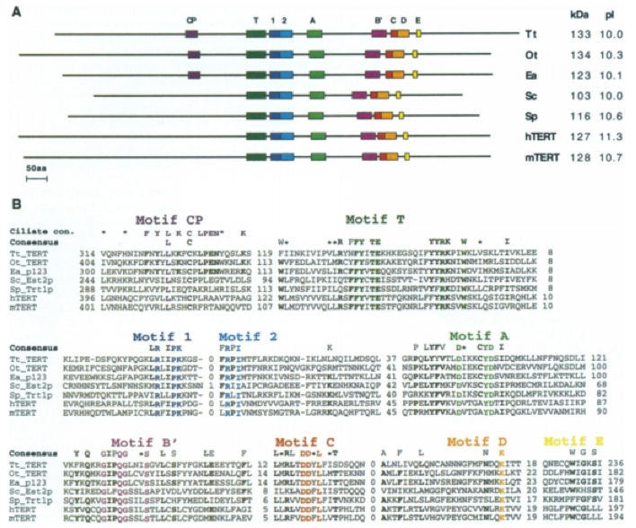 Figure 3. (A) Motifs conserved among 7 species. Motifs 1, 2, A, B', C, D and E are associated with reverse transcriptase. The T motif is specific to telomerase and the CP motif is specific to the ciliates, which have a higher telomere number than the remaining species. (B) Comparison of amino acid sequences across the 7 species (hTERT = human, mTERT = Mus muscularus, Sc.Est.2p= Saccharomyces cerevisiae, Sp. trt1p = schizosaccharomyces pombe, Tt TERT=tetrahymena thermophila, Ot. Tert =oxytricha trifallas, Ea. p123=euplotes aediculatus). The colored amino acids indicate the residues that are conserved within the labeled motifs. The consensus sequence indicates residues that are conserved in more than 5 of the species, which are shown in bold. Lastly, the ciliate consensus sequence only includes the conserved sequences in ciliates that correspond to the CP motif.