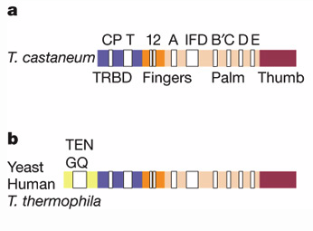 Telomerase is specific to eukaryotic organisms since the end replication problem applies only to linear DNA. However, Gillis et al. describes telomerase as part of the retroviral reverse transcriptase superfamily (2008). The researchers compare the telomerase of T. castaneum to the closest homologue of telomerase, HIV reverse transcriptase, to demonstrate a high degree of similarity between the active sites of the two proteins (Figure 2). In addition, the ringlike structure of telomerase is similar to the structure of viral RNA polymerases, B-family DNA polymerases and the HIV reverse transcriptase (p66) (Figure 1). The similar structure implies a similar function, which is supported by the fact that they all add nucleotides to nucleic acid strands. This similarity demonstrated in structure and function among these different proteins suggests a close evolutionary relationship (Figure 5). However, since these comparisons are between homologues rather than orthologs, the following discussion will focus on the orthologs of telomerase.