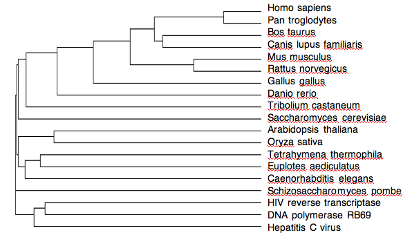 A comparison of multiple species confirms the phylogenetic relationships of these species and indicates an ancient origin of telomerase. The relationships of these organisms follow what you would expect given current knowledge of phylogenies. Notably, the sequences of HIV reverse transcriptase, DNA polymerase and Hepatitis C are different from telomerase in all species, which indicates that the telomerase of all species is more similar to one another than to the other polymerases, supporting the hypothesis that they all evolved from one ancient origin (Figure 6).