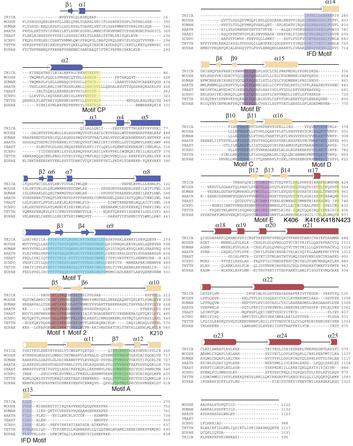 Figure 4. General motif comparison between T. castaneum (a) and yeast, human and T. thermophila (b). The white boxes indicate the labeled motifs and the colors indicate the labeled domains.