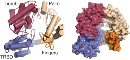 Figure 2. The three domains of the catalytic subunit TERT of telomerase. The TRBD is the high-affinity TER binding domain and contains mostly alpha-helices (purple). The reverse transcriptase domain contains both the palm and fingers sub domains, composed of a mixture of alpha helices and beta strands (tan and orange). The thumb domain is the CTE domain that has an elongated helical bundle and long loops at the surface (red).