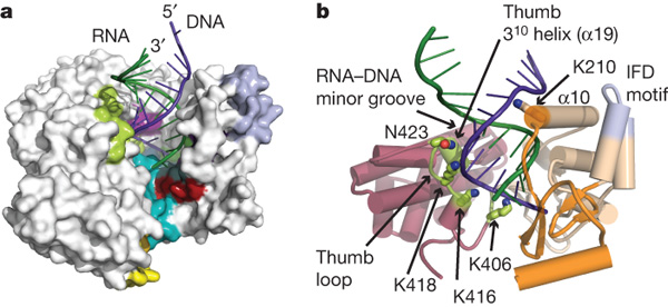 Figure 3. a) The interaction of TERT, the RNA template and the growing DNA strand. b) The thumb domain perfectly fits the double helix structure of DNA. K418, K406 and K418 are all lysine residues that stabilize the 3' negatively charged DNA backbone due to their positive charges. The alpha helix 19 interacts with the RNA-DNA minor groove to stabilize the RNA binding to DNA.