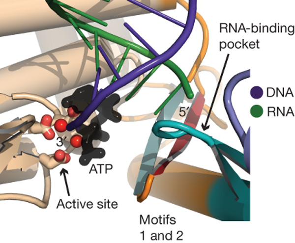 TRBD binds to the TER template and positions it near the active site. The domain forms a cavity on the side of the ring (Figure 2), which allows for the placement of the RNA template inside the ring at the active site. A ß-hairpin extends from the RNA-binding pocket and interacts with the thumb loop and motifs 1 and 2 (Figure 4). The researchers hypothesized that the ß-hairpin may act as an allosteric switch to couple RNA binding and the placement of the RNA template at the active site. Proper placement of the RNA template would facilitate pairing with the DNA substrate. Additionally, it may help to explain “repeat addition processivity,” which is the telomerase-specific feature that allows for multiple additions of telomeric sequences. (Gillis et al., 2008).