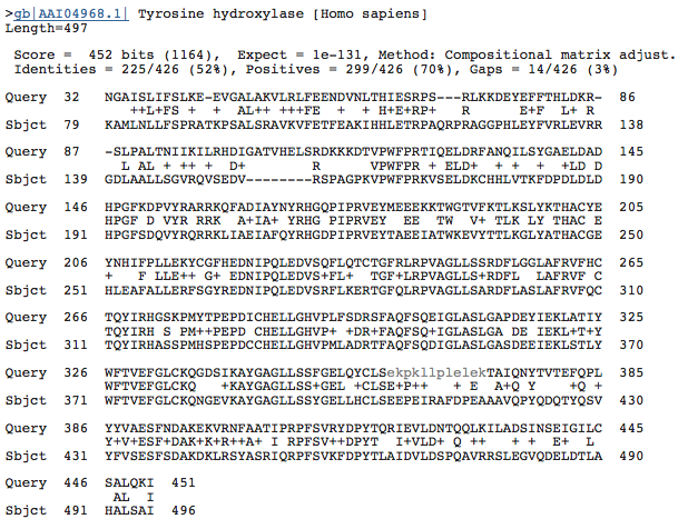Generally speaking nucleotide sequences are more dissimilar than amino acid sequences. In comparison to the BLAST results above, when using the nucleotide sequences, the amino acid sequences are considerably more similar. This is due to a couple of reasons. First mutliple codons can code for the same amino acid, so nueclotides can be different while amino acids are the same. Second, like most proteins, the gene sequence is made up of introns and exons. Changes in the nucelotide sequence within introns would not affect the ultimate amino acid sequence. PheOh has 452 amino acids, while TrpOH has 490, and TyrOh has 497. Figures below shows a BLAST alignment of each protein with PheOH. Both expected values are infintesimal, nearly zero, indicating a high probability that these proteins are related and not randomly similar. 52% of the amino acids in TyrOH match PheOH and 54% of the amino aicds in TrpOH match PheOH.
