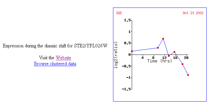 Function Junction is another website used to assess the function of yeast genes. The database includes information gathered from six other databases. For STE2, we are not questioning its function, but merely illustrating that what we know about it corresponds to the information obtained from these databases. Each database does say that STE2 encodes the alpha-factor pheromone receptor and that that receptor is a 7-transmembrane protein embedded in the plasma membrane. The best database that is searched using Function Junction is the Yeast Microarray Global Viewer from the Laboratoire de genetique moleculaire, Paris, France. Function Junction takes a selection of these microarrays and shows how your specific gene is expressed under certain conditions.