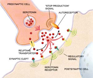 As a serotonin transporter, the protein encoded by the 5-HTT gene is responsible for the reuptake of serotonin into the presynaptic cell after it has been released into the synaptic cleft to signal the adjacent neuron. The precise structure of this protein has not been determined, but it is known to be located in the presynaptic cell membrane. The activity and number of the serotonin transporter proteins determine the length of time that the chemical signal remains in the synapse (Glatz, et. al. 2003). This basic process is shown in the image below.