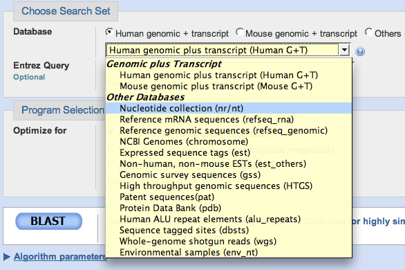 In the box "Choose Search Set" you should select the database you want to search for your entered nucleotide sequence. If you know it came from the human or mouse genome, those options are readily available for you. If you're not sure where it came from, like my sequence, you should choose the "Nucleotide Collection (nr/nt)" option, which will search for your sequence in all nonredudant nucleotide databases. If you know it came from a species other than mouse or human, choose the "Nucleotide collection" option, then on the line underneath the selection box, type the name of the species you want to search. There are many other options on the pull-down menu to explore, but the most likely databases to be of use to you are the ones previously discussed.