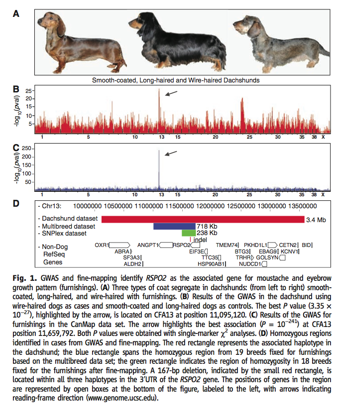 Using a canine SNP chip, 96 dachshund with wire-haired with furnishings, smooth, and long haired without furnishings, 76 Portuguese water dogs of the curled and wavy haired varieties, and data from 903 dogs from 80 breeds (CanMap) were subjected to the same tests. A genome-wide association study (GWAS) was used within-breed to determine highly associated loci. Furnishings in dachshunds were determined using by using longhaired dogs as controls and known pedigree, with a single-marker GWAS, finding a 718-kb homozyguous haplotype in all breeds within a 3.4 Mb segment on chromosome 13. Fine-mapping found a 238 kb region, the R-spondin-2 (RSPO2) gene, which synergizes with Wnt and activates β-catenin. These genes are associated with hair-follicle growth, hair-follicle tumors, and a change in the pathways is associated with human East-Asian hair type. Dogs with furnishings were found to be homozygous or heterozygous for a 167 bp insert in RSPO2, showing a dominant inheritance pattern. Homozygosity for the ancestral trait was found in all 406 dogs without furnishings. The position of the mutation at the 3‘UTR, which controls mRNA stability, lead a tripling in gene expression in the derived gene.