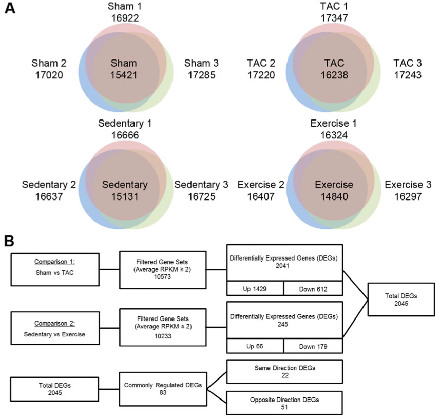 A. These Venn diagrams show how many expressed genes were found in the replicates of each treatment: sham, TAC, sedentary and exercise-training mice. This shows that the many of the genes found in any of the three individuals were found in all, indicating that the RNA-Seq was accurate.