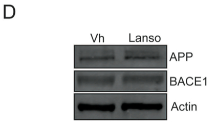 D. In order to understand the reason for the increase in Aβ40 and Aβ37 levels in the presence of lansoprazole, they looked at the effects of lansoprazole on some of the proteins involved in the APP processing pathway. The researchers examined the effects of lansoprazole on APP, BACE1 (the first enzyme to cleave APP), and actin (the negative control). The western blot shows no difference in the protein levels between treated and untreated cells.