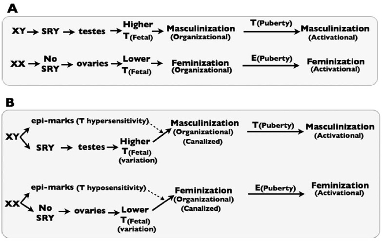 The classical view of sexually dimorphic development (A) is that higher androgen levels in XY fetuses and