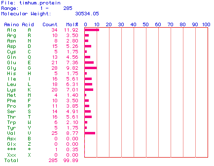 The secondary structure predicted is typical of a globular protein, with a good mixture of helical coils and pleated sheets. This is expected for an enzyme like triosephosphate isomerase and can be seen in the Rasmol image of triosephosphate isomerase (MMDB Id: 2490, PDB Id: 1YPI).