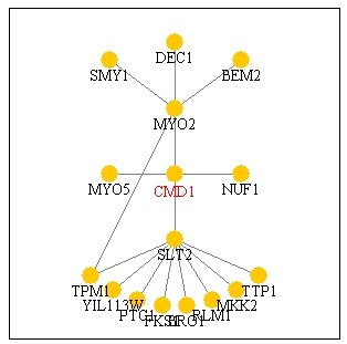 Figure 15: Screen capture of Pathcalling interactions of CMD1. According to this picture, it directly interacts with MYO2, NUF1, MYO5, and SLT2 (Genescape Portal Website, 2000; <Function Junction>).