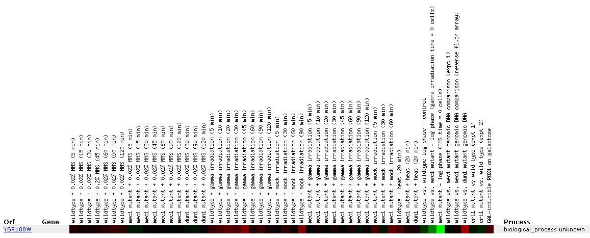Throughout the exposure to the various DNA-damaging agents, expression of YBR108W remains unchanged, as designated by the black portions of the color bar. Induction can be seen during exposure to gamma irradiation, with peak induction at the 45 minute mark. There also appears to be induction after 90 minutes of mock irridiation of wildtype cells, although it is unclear to me what exactly constitutes mock irradiation. The MEC1 mutant exhibited no induction of YBR108W throughout the 120 minutes of gamma irradiation.