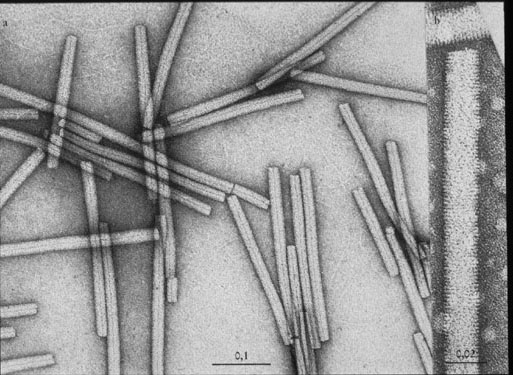 image of the Tobacco Mosiac Virus (TMV). Image courtesy of Carl Wetter. |