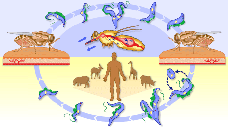 The parasite is transfered from animals to humans and vice versa via the tsetse fly vector. This image is a cartoon diagram of that process and the cellular rearrangement that the Trypanosoma brucei undertake to make this existence possible.