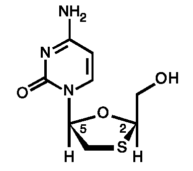 Nucleos(t)ide analogues are another treatment option for HBV. These drugs impair viral replication by directly inhibiting reverse transcriptase. Although these drugs can be administered orally, continued treatment must be provided to maintain viral suppression since this type of therapy seldom eliminates the virus (Ocama et. al., 2005). The first approved nucleoside analogue was lamivudine. Lamivudine is a cytosine analogue that inhibits reverse transcriptase by integrating into DNA chains and causing chain termination (Buster and Janssen, 2006). Although lamivudine has an excellent safety profile and is known to cause increased HBeAg seroconversion in HBeAg-positive patients, resistance to the drug occurs in approximately 24% of patients after treatment over 1 year and in 67% after treatment for 2 years (Ocama et. al., 2005). The figure below shows the chemical structure of lamivudine.